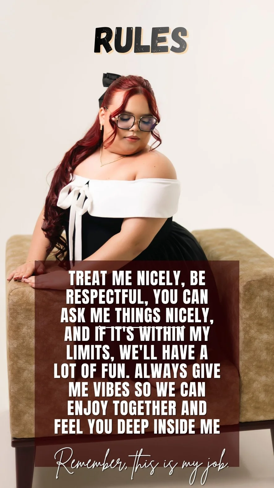 Trátame bien, sé respetuoso, puedes preguntarme cosas con amabilidad y, si está dentro de mis posibilidades, nos divertiremos mucho. Siempre quiero sentir buenas vibraciones para que disfrutemos juntos y sentirte profundamente dentro de mí.